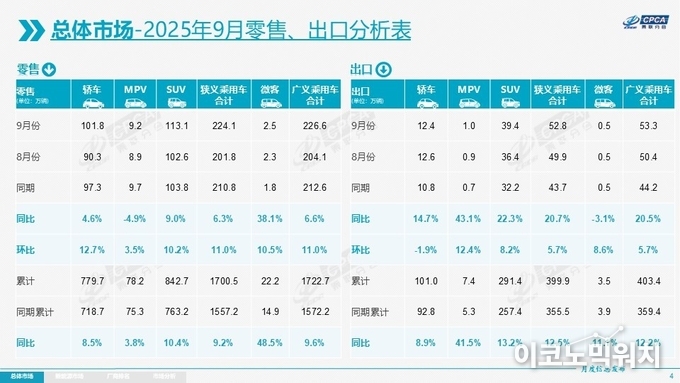 중국 승용차협회(CPCA)가 13일 공개한 '2025년 9월 전국 승용차 시장 분석' 자료에 따르면 9월 한달간 모두 224만1000대의 승용차가 판매됐다. 이는 전년 동기 대비 6.3%, 전월 대비 11.0% 증가한 것이다.