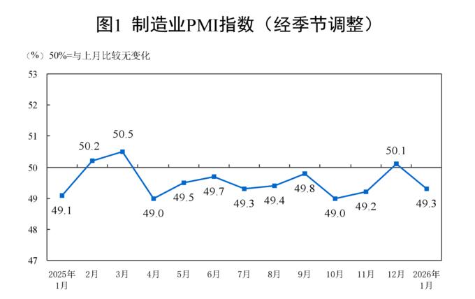 중국 국가통계국이 지난달 31일 공개한 1월 제조업 PMI는 49.3으로 전월 대비 0.8포인트 떨어졌다.