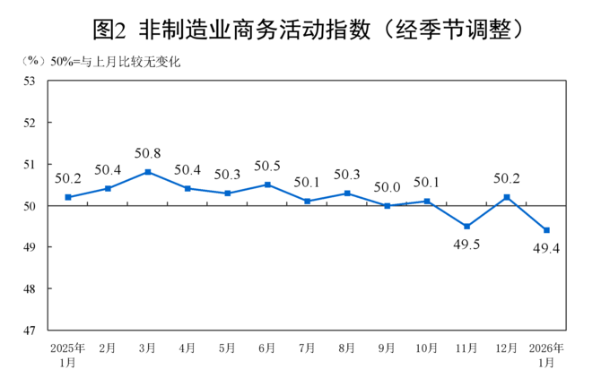 1월 비제조업 PMI 역시 전월 대비 0.8포인트 하락한 49.4로 집계됐다. 비제조업 PMI의 경우 금융을 제외한 부동산 등이 크게 떨어졌다.